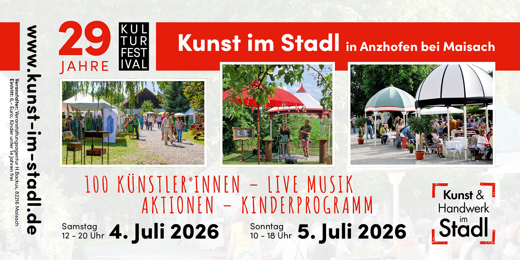 Samstag 04. Juli 2026 12:00 – 20:00 Sonntag 05. Juli 2026 10:00 – 18:00 www.kunst-im-stadl.de 82216 Anzenhofen bei Maisach